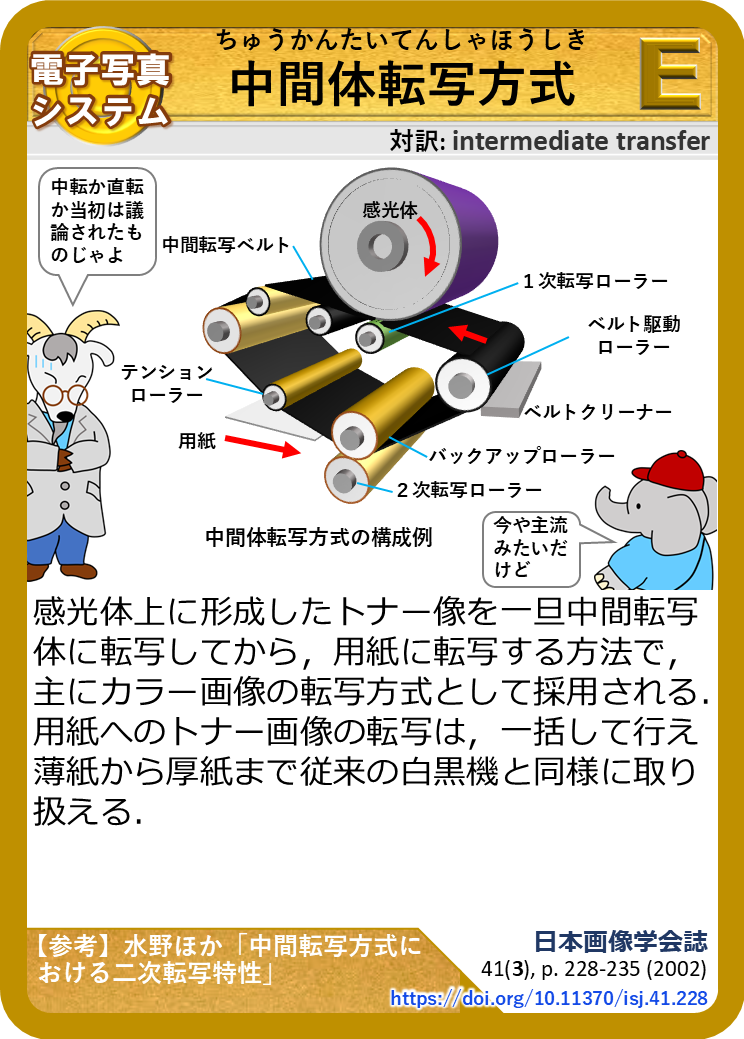 感光体上に形成したトナー像を一旦中間転写体に転写してから,用紙に転写する方法で,主にカラー画像の転写方式として採用される.用紙へのトナー画像の転写は,一括して行え薄紙から厚紙まで従来の白黒機と同様に取り扱える.