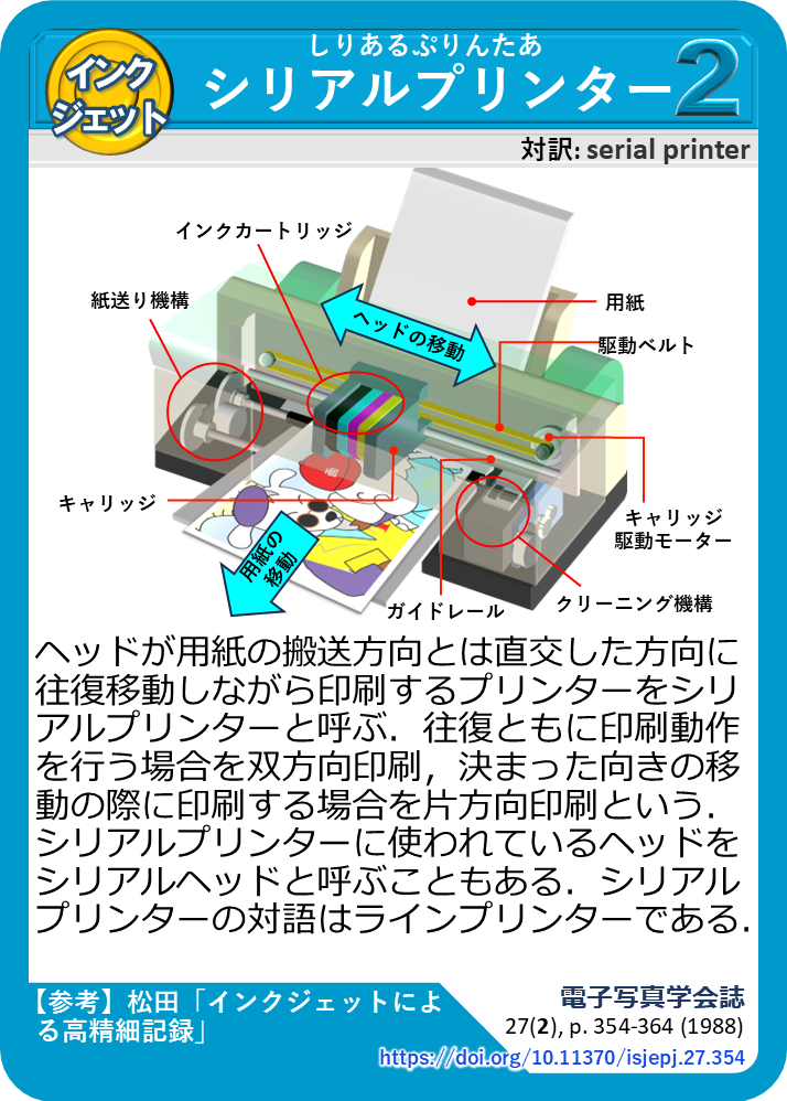 ヘッドが用紙の搬送方向とは直交した方向に往復移動しながら印刷するプリンターをシリアルプリンターと呼ぶ.往復ともに印刷動作を行う場合を双方向印刷,決まった向きの移動の際に印刷する場合を片方向印刷という.シリアルプリンターに使われているヘッドをシリアルヘッドと呼ぶこともある.シリアルプリンターの対語はラインプリンターである.