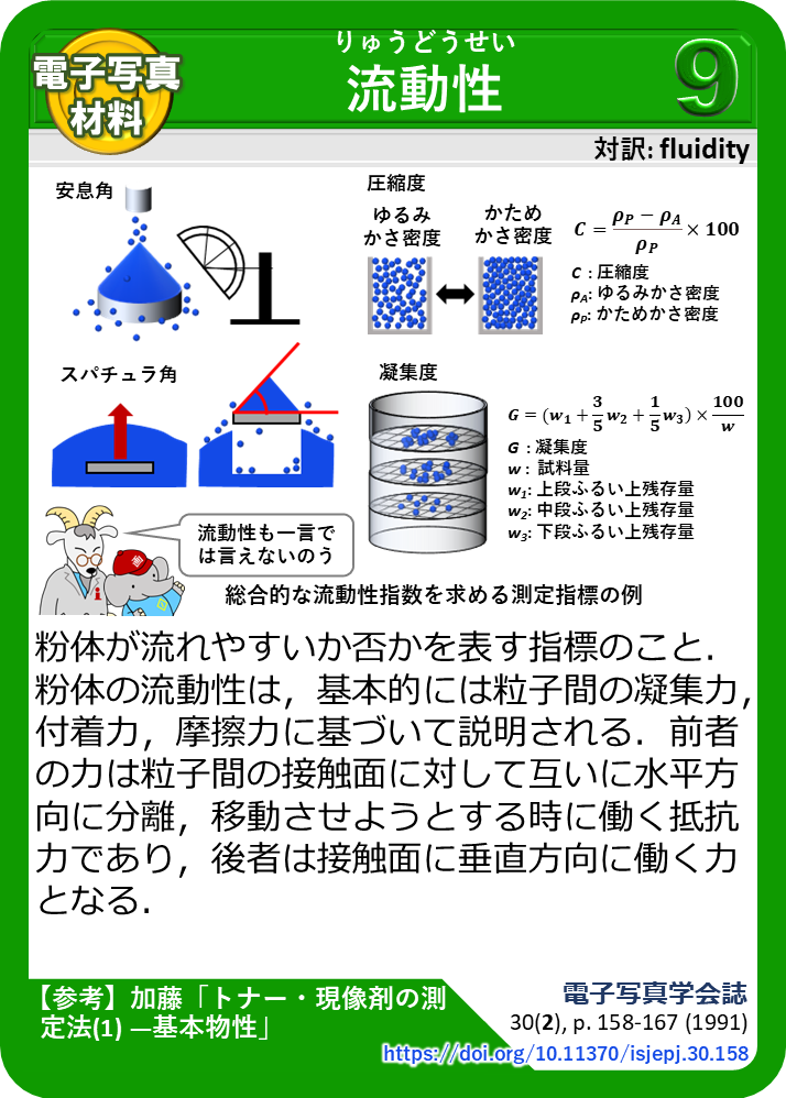 粉体が流れやすいか否かを表す指標のこと.粉体の流動性は,基本的には粒子間の凝集力,付着力,摩擦力に基づいて説明される.前者の力は粒子間の接触面に対して互いに水平方向に分離,移動させようとする時に働く抵抗力であり,後者は接触面に垂直方向に働く力となる.