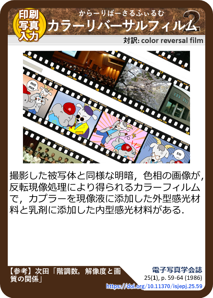 撮影した被写体と同様な明暗,色相の画像が,反転現像処理により得られるカラーフィルムで,カプラーを現像液に添加した外型感光材料と乳剤に添加した内型感光材料がある.