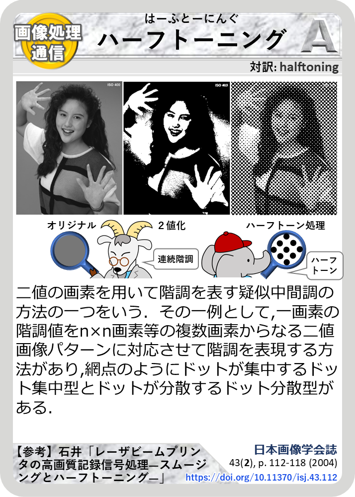 二値の画素を用いて階調を表す疑似中間調の方法の一つをいう.その一例として,一画素の階調値をn×n画素等の複数画素からなる二値画像パターンに対応させて階調を表現する方法があり,網点のようにドットが集中するドット集中型とドットが分散するドット分散型がある.