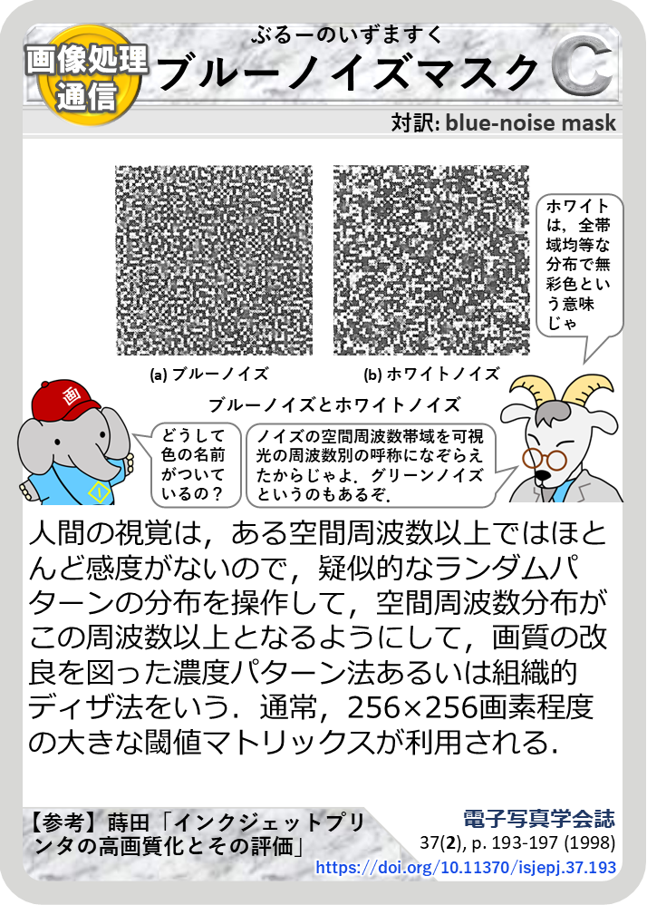 【問題】ブルーノイズマスクは,知覚可能な空間周波数の高域側にエネルギーが集中したノイズですが,それに対して知覚可能な空間周波数の中域にエネルギーを集めたランダムノイズを何と呼ぶでしょうか.