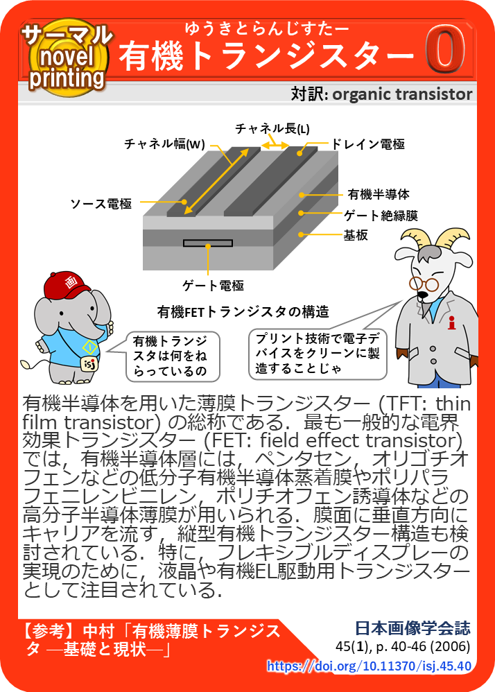 有機半導体を用いた薄膜トランジスター (TFT: thin film transistor) の総称である.最も一般的な電界効果トランジスター (FET: field effect transistor) では,有機半導体層には,ペンタセン,オリゴチオフェンなどの低分子有機半導体蒸着膜やポリパラフェニレンビニレン,ポリチオフェン誘導体などの高分子半導体薄膜が用いられる.膜面に垂直方向にキャリアを流す,縦型有機トランジスター構造も検討されている.特に,フレキシブルディスプレーの実現のために,液晶や有機EL駆動用トランジスターとして注目されている.