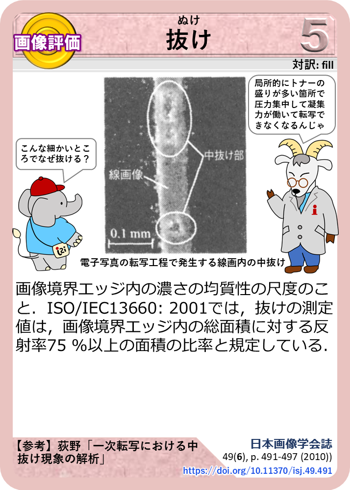 画像境界エッジ内の濃さの均質性の尺度のこと.ISO/IEC13660: 2001では,抜けの測定値は,画像境界エッジ内の総面積に対する反射率75 %以上の面積の比率と規定している.