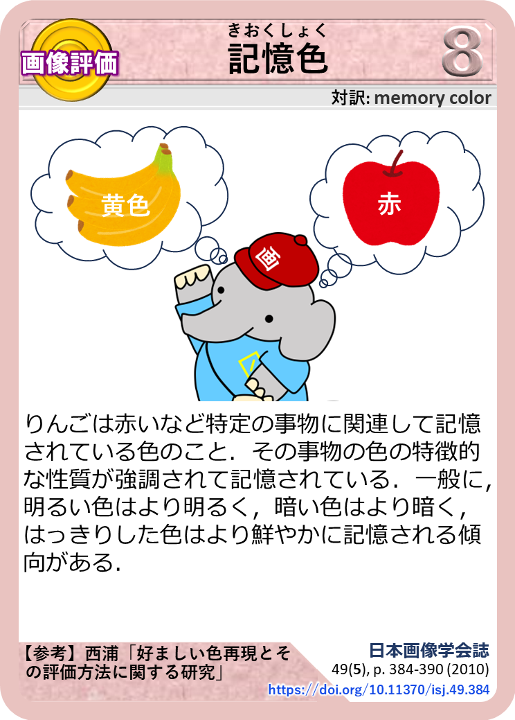 りんごは赤いなど特定の事物に関連して記憶されている色のこと.その事物の色の特徴的な性質が強調されて記憶されている.一般に,明るい色はより明るく,暗い色はより暗く,はっきりした色はより鮮やかに記憶される傾向がある.
