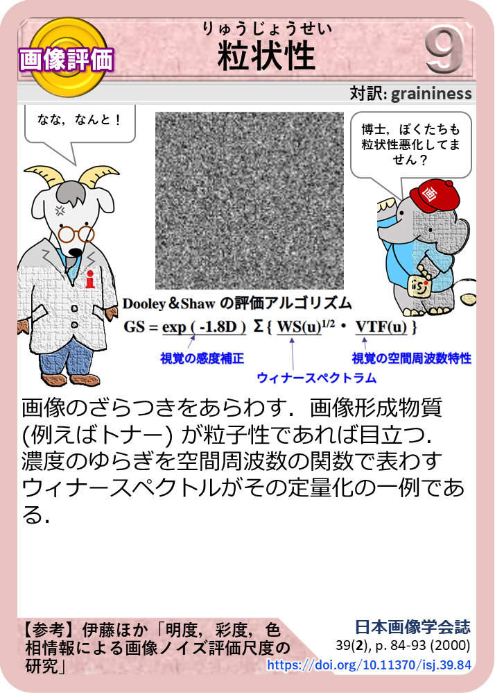 画像のざらつきをあらわす.画像形成物質 (例えばトナー) が粒子性であれば目立つ.濃度のゆらぎを空間周波数の関数で表わすウィナースペクトルがその定量化の一例である.